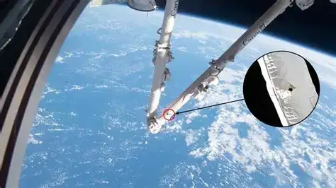 国际空间站机械臂遭空间碎片撞击。图源:NASA