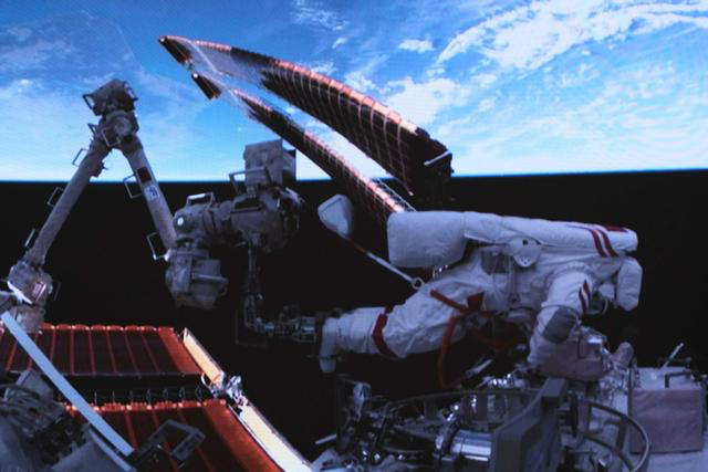 神舟18号乘组出舱为空间站的部分舱外管路、电缆及关键设备安装空间碎片防护装置。图源:新华社